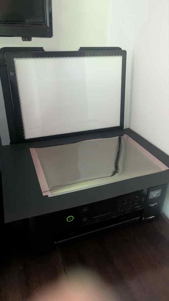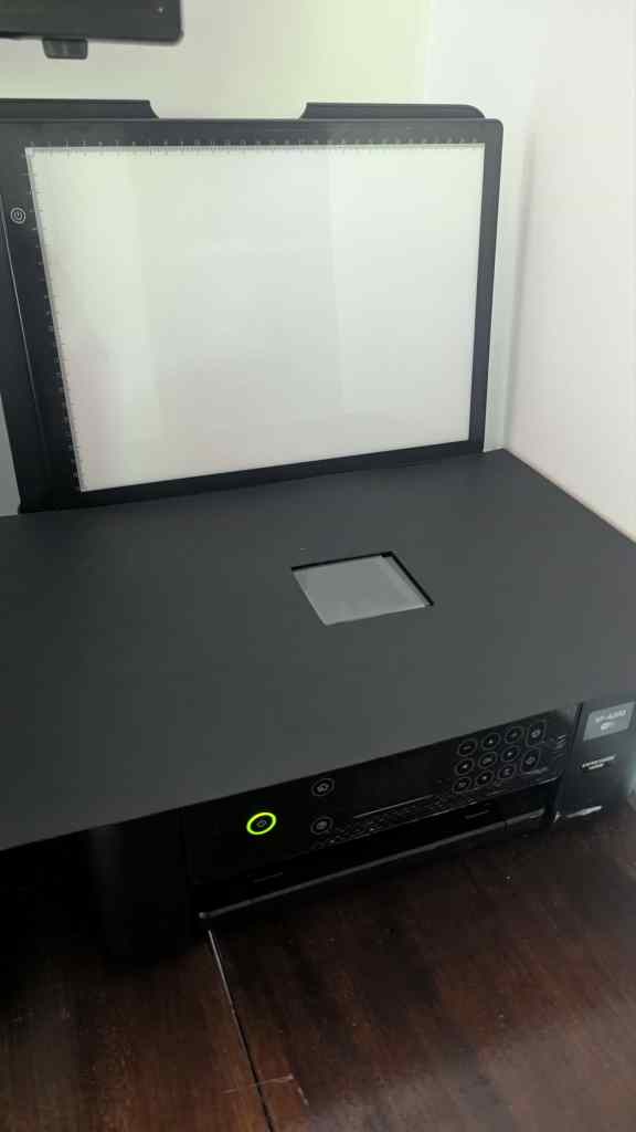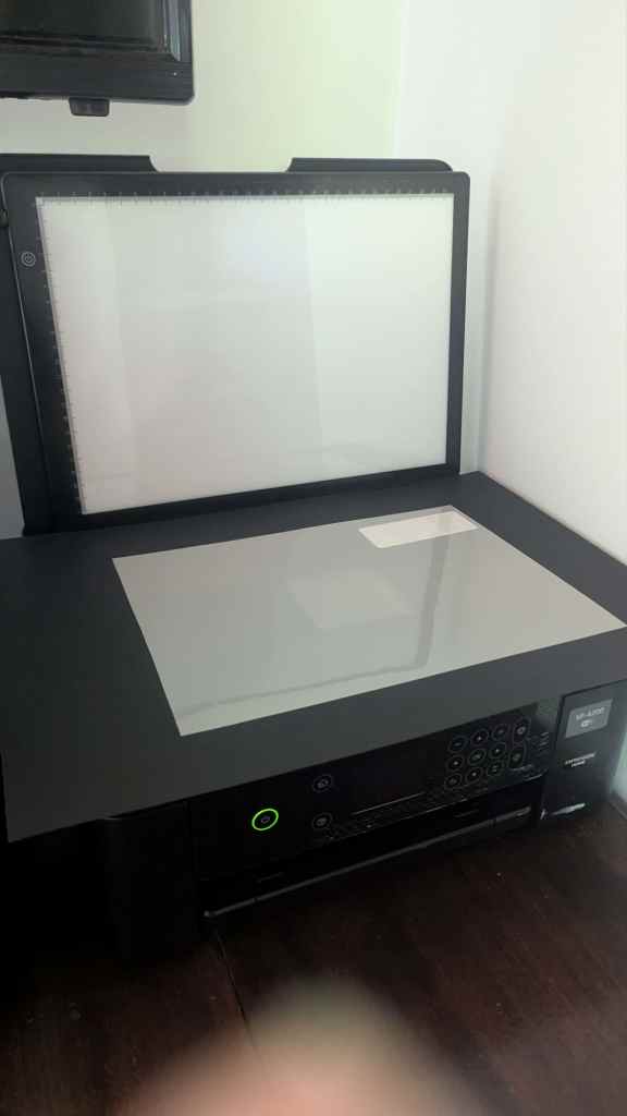 With that in mind, while researching medium–large format scanners and digital camera scanning, I wondered if I could set up the scanner on my printer in the same fashion. For the most part, it seemed as if it would work, presenting its first barrier only when I realised my scanner lacked a backlight. This issue wasn’t too difficult to resolve fortunately—inspired by the idea of a light pad used for sketching, I bought a $7 backlight and began scanning with it the next day.